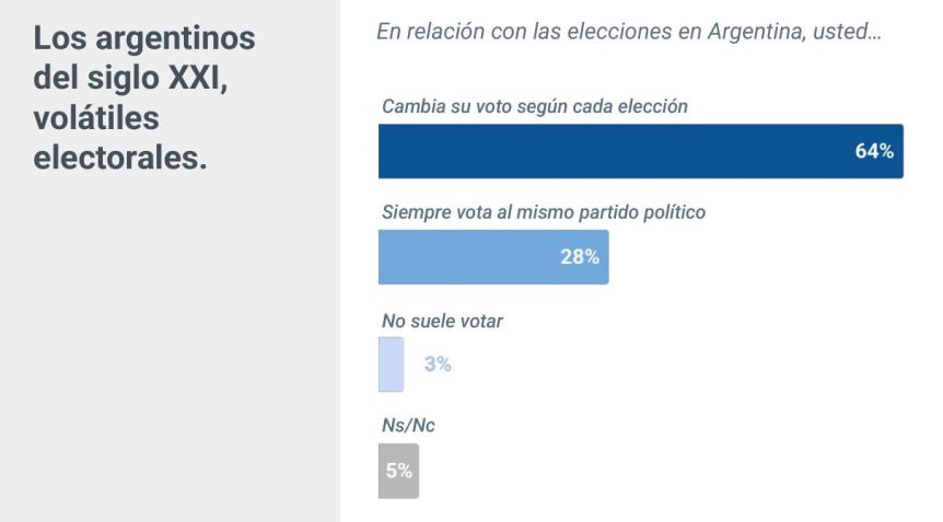 La encuesta de Pulsar.UBA también revela una cierta volatilidad de los argentinos en el voto, ya que determinó que dos de cada tres personas cambia su voto según cada elección, contra un 28% que elige siempre al mismo partido.