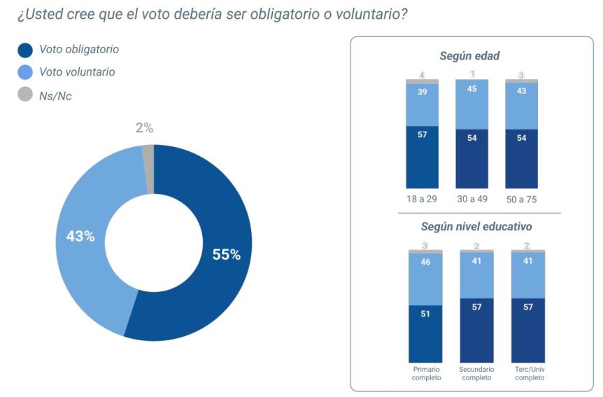En esta ocasión, se consultó a 1252 personas de todo el país sobre cuestiones relativas al proceso electoral, y uno de los datos que reveló la encuesta es que hay un amplio sector que cree que el voto debería ser voluntario en vez de obligatorio. Casi la mitad de la gente piensa eso, aunque aún es mayoría la que respalda la obligatoriedad del sufragio.