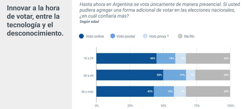 En cuanto a la forma de votar, la mayoría de los argentinos se muestran dispuestos a que se amplíen las posibilidades, con el voto online recogiendo la mayoría de los apoyos (un 46%), pero el voto postal y el voto proxy (es decir, delegando en otra persona la tarea de votar por uno) también sumando cierto nivel de confianza.