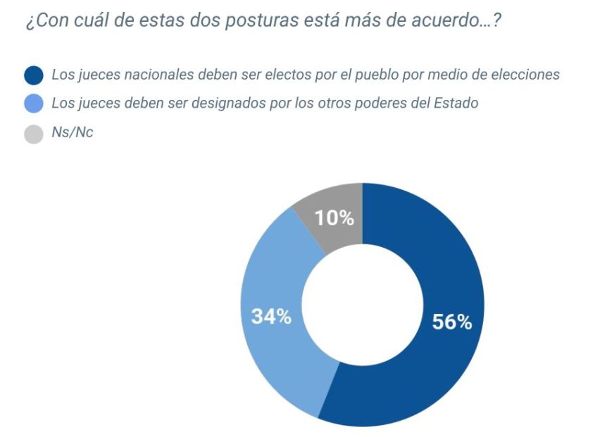 Contra el 56% que tiene esta opinión, hay una minoría del 34% que cree que los jueces deben ser designados por otros poderes del Estado (como ocurre actualmente).
