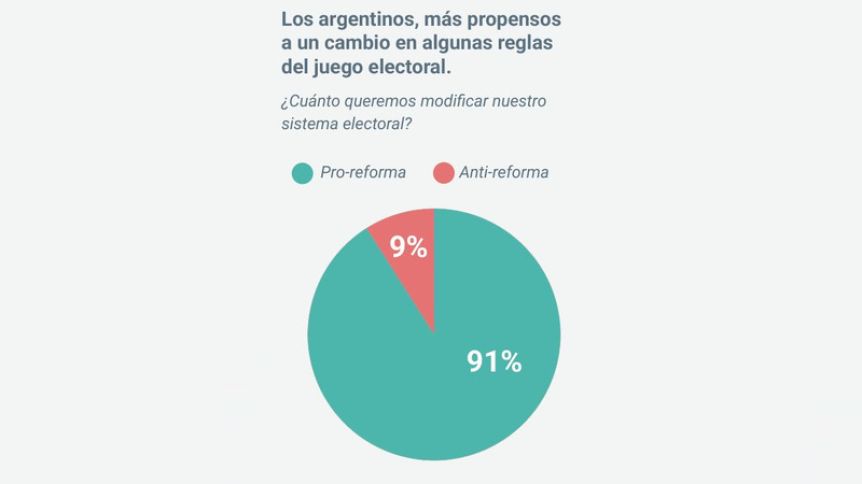 En efecto, según una encuesta realizada por Pulsar, un 91% de los argentinos se muestran a favor de algún tipo de reforma de los procesos electorales, como que el sufragio sea voluntario o que se pueda realizar en línea.