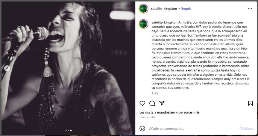 “Es imposible transmitirles lo que sentimos en estos momentos, pero quienes compartimos veinte años con ella haciendo música, riendo, creando, viajando, planeando lo imposible, concretando proyectos, conversando de temas profundos o bromeando sobre trivialidades, la vamos a extrañar como quizás hasta hoy no sabíamos que se podía extrañar a alguien en esta vida. Solo nos reconforta la noción de que tendremos siempre muy presentes la compañía dulce de su recuerdo y también los registros de su voz, su sonrisa, sus canciones”, cerraron.