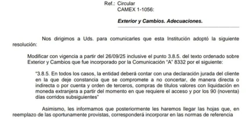 Por eso, hoy envió una comunicación a los operadores de cambio en la que los instruye a exigir a cada cliente una declaración jurada “en la que deje constancia [de] que se compromete a no concertar, de manera directa o indirecta o por cuenta y orden de terceros, compras de títulos valores con liquidación en moneda extranjera a partir del momento en que require el acceso y por los 90 (noventa) días corridos subsiguientes”.
