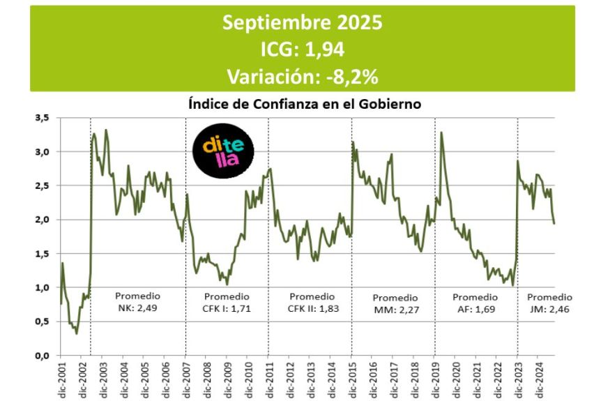 El Índice de Confianza en el Gobierno (ICG) que elabora mes a mes la Universidad Torcuato Di Tella (UTDT), en base a una encuesta de la consultora Poliarquía, cayó en septiembre un 8,2%, y se ubicó en el punto más bajo desde que Milei accedió a la presidencia.