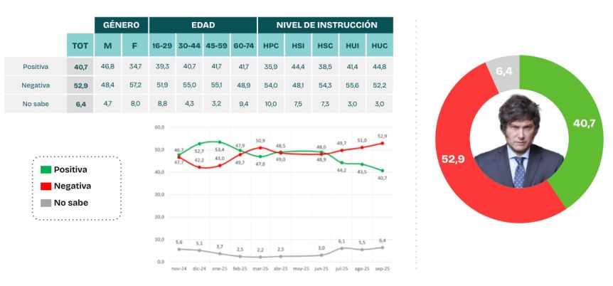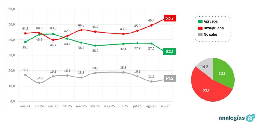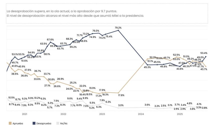 En tanto, la consultora Analogías, en un exhaustivo trabajo publicado hoy, encontró que más de la mitad de la gente desaprueba la gestión que ha tenido hasta ahora el gobierno libertario, y la brecha entre la desaprobación y la aprobación creció fuertemente en los últimos tres meses.