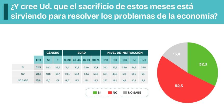 Una mayoría de los consultados dijeron que creen que el sacrificio que están haciendo no va a servir para resolver los problemas de la economía, en contradicción con el mensaje de campaña de Milei, que viene insistiendo en que “esta vez el esfuerzo va a valer la pena”.