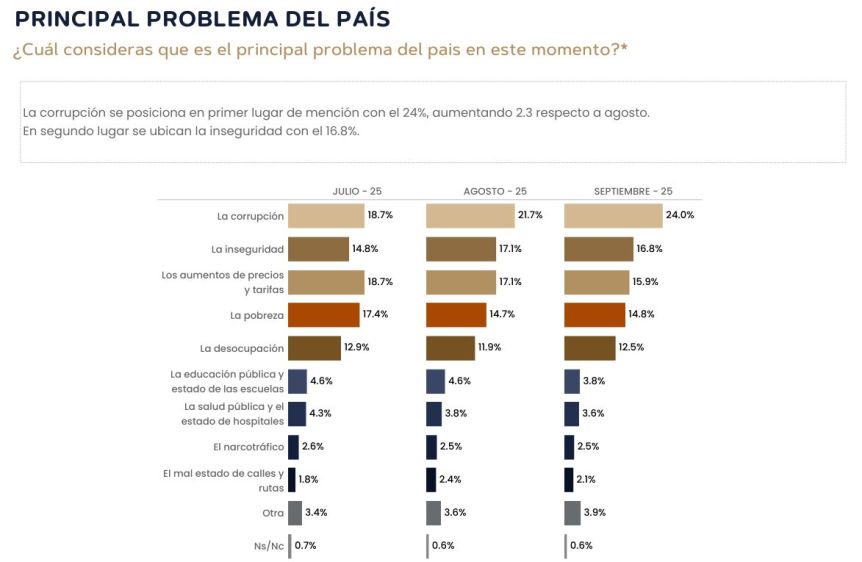 Management & Fit también ubica a la corrupción como un gran problema y evidencia el “factor Karina” como uno de los motores del descrédito del gobierno, además de la crisis económica. En los últimos tres meses, la mención de la corrupción como principal problema del país no sólo se ubicó en el primer lugar de la lista, sino que viene creciendo.