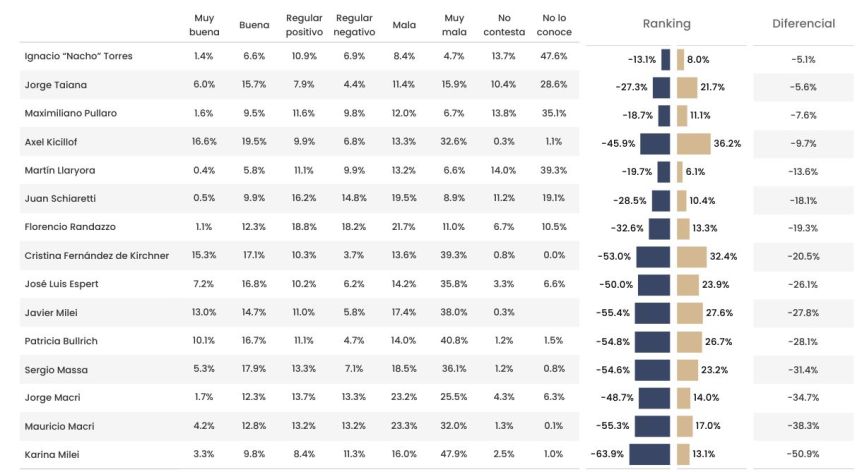 De hecho, al medir la imagen de distintos dirigentes nacionales, la consultora determinó que todos los considerados, incluyendo a Milei, tienen un diferencial negativo (es decir, más imagen negativa que positiva), pero la diferencia es abrumadora en el caso de Karina, con un diferencial de –40,8%.