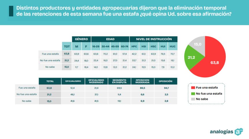 En materia económica, el 64% definió la quita de retenciones a las exportaciones como “una estafa” por no haber generado beneficios a los productores, mientras que el 56% opinó que el apoyo financiero anunciado por Estados Unidos implicará una injerencia en los asuntos internos de Argentina.