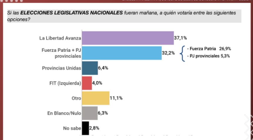 De acuerdo con el sondeo, La Libertad Avanza obtiene el 37,1% de las preferencias, mientras que Fuerza Patria junto a los PJ provinciales suman 32,2%.