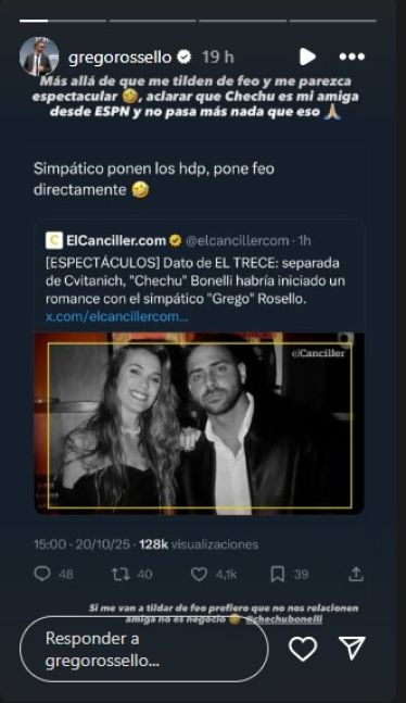 “Más allá de que me tilden de feo y me parezca espectacular, quiero aclarar que Chechu es mi amiga desde ESPN y no pasa más que eso”, afirmó Grego en una historia de Instagram.