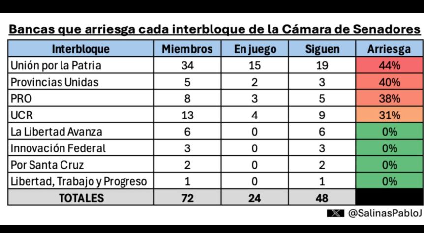Otra fuerza política que arriesga mucho en esta elección es Fuerza Patria, ya que ponen en juego 46 de los 98 escaños que tienen, lo que representa un 47% del total. Sin embargo, de realizar una buena elección puede sostenerlos para ser la primera minoría. Por su parte, el oficialismo nacional es quien menos arriesga en esta elección, ya que solo renueva ocho de sus 32 escaños.