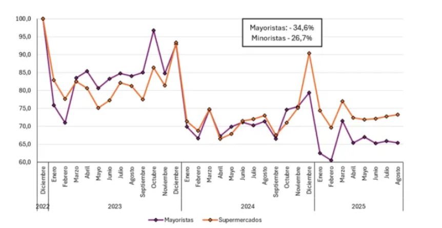 Desde diciembre de 2023, las ventas mayoristas acumulan una retracción del 35%, y las de los supermercados, del 27%, reflejando el fuerte deterioro del poder adquisitivo. Aunque la inflación mostró una desaceleración, los ingresos reales siguen rezagados frente a los precios, lo que impacta directamente en el consumo de los hogares.