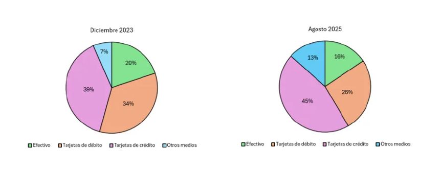 Entre diciembre de 2023 y mayo de 2025, el uso del crédito pasó del 39% al 45% de las operaciones, mientras que las compras con débito cayeron del 34% al 26%, las realizadas en efectivo del 20% al 16%, y las billeteras virtuales crecieron del 7% al 13%.