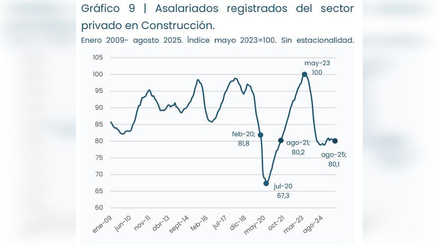 “En la Construcción, la comparación interanual arroja un aumento de casi 4,8 mil ocupados, equivalente a 1,3%. El valor de agosto de 2025, sin embargo, resulta similar al de febrero de 2020 y agosto de 2021 y supera solo a los registros de la pandemia, considerando la serie iniciada en 2009. Desde el máximo de la serie de mayo de 2023, se perdieron casi 94 mil puestos de trabajo”, indica el informe.