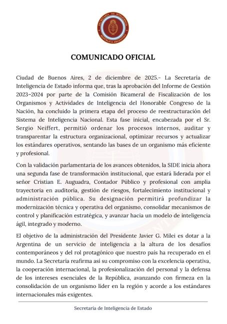 “La Secretaría de Inteligencia informa que, tras la aprobación del Informe de Gestión 2023-2024 por parte de la Comisión Bicameral de Fiscalización de los Organismos y Actividades de Inteligencia del Honorable Congreso de la Nación, ha concluido la primera etapa del proceso de reestructuración del Sistema de Inteligencia Nacional”, inició el mensaje oficial.