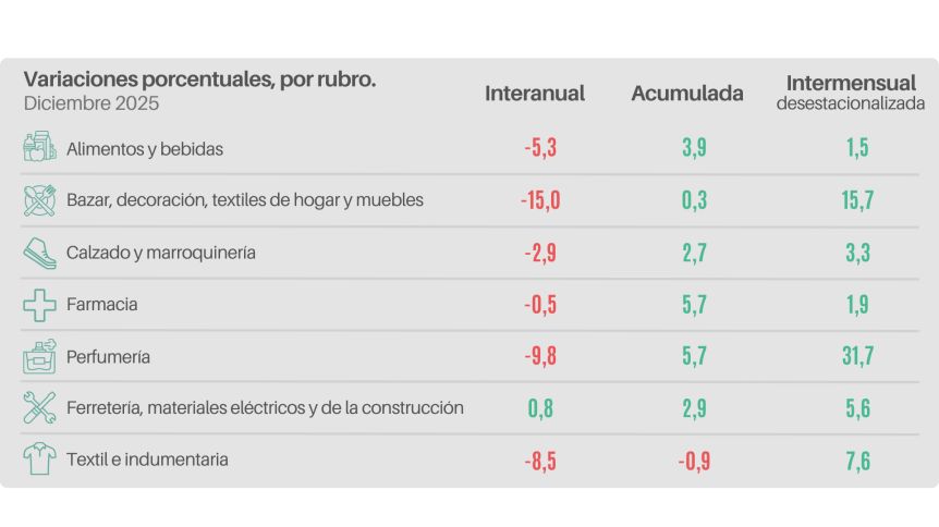 El análisis por rubros confirma el escenario recesivo: seis de los siete sectores relevados terminaron el año en rojo. Las caídas más pronunciadas se registraron en Bazar y decoración (-15%), Perfumería (-9,8%) y Textil e indumentaria (-8,5%).