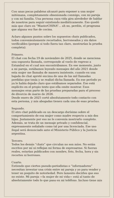 Además, afirmó que desde enero de 2025 cortó todo tipo de contacto con esa persona y que sus abogadas cuentan con las pruebas correspondientes. En relación con otro chat difundido, indicó que se trató de un mensaje privado y confidencial, con fuertes críticas sobre cuestiones vinculadas a la maternidad, cuya publicación —según remarcó— constituye un delito que será denunciado ante la Justicia.