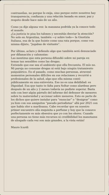 Con un tono duro y confrontativo, Icardi cerró su mensaje reafirmando la solidez de su relación actual y asegurando que no existe ninguna crisis. El comunicado no solo buscó aclarar su posición frente a los chats filtrados, sino también marcar un límite frente a lo que considera una exposición injustificada de su vida privada, que ahora promete trasladar al ámbito judicial.