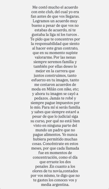 En el mensaje, quien escribe asegura haber sido clave en la firma de un contrato con un club del que era fan incluso antes de la llegada del jugador, y remarca el esfuerzo realizado para concretar acuerdos laborales y comerciales, tanto en el fútbol como en el mundo de la moda. También se menciona el desgaste que implicó construir la imagen pública del futbolista y cómo, según el texto, esa imagen “se cayó a pedazos” en el último tiempo.