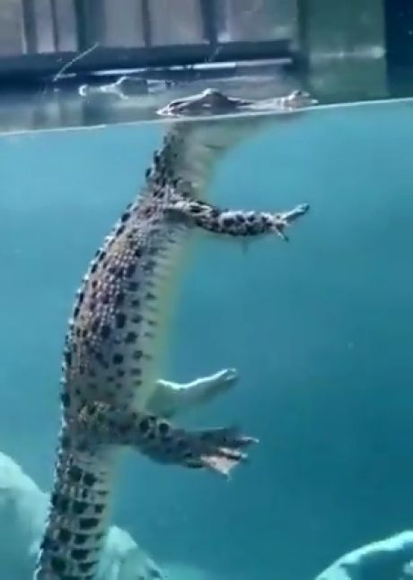 Gracias al tanque de vidrio, podemos ver como se mueven los cocodrilos en el agua. Este en particular parece estar demasiado tranquilo y cómodo mientras nada sin ninguna preocupación.