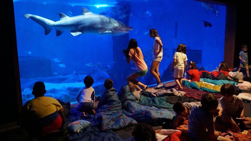 El National Aquarium de Baltimore (Estados Unidos) organiza eventos donde los participantes llevan bolsas de dormir y pasan la noche junto a los tanques iluminados, escuchando el lento vaivén de los peces y tiburones a su alrededor. También en Atlanta, el Georgia Aquarium propone la experiencia donde los visitantes descansan frente a la galería de tiburones e imponentes ventanales marinos.