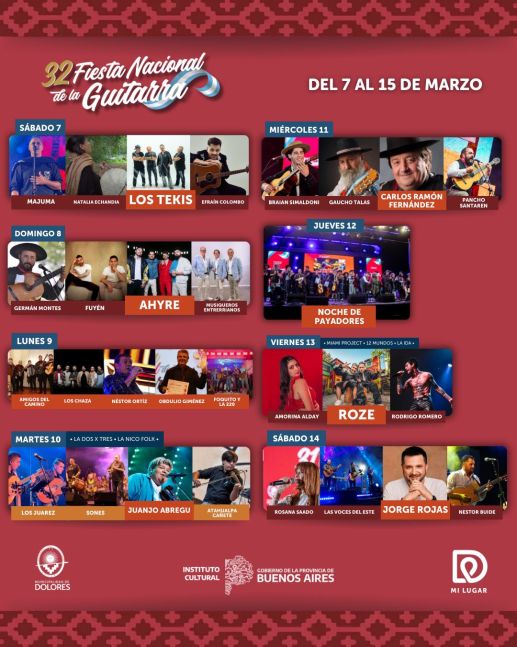 La Fiesta Nacional de la Guitarra anunció su grilla oficial y ratificó su lugar como uno de los encuentros culturales más importantes del país. Del 7 al 14 de marzo, la ciudad de Dolores recibirá a artistas de fuerte convocatoria como Jorge Rojas, Los Tekis, Ahyre, Carlos Ramón Fernández, Rodrigo Romero y Roze, en una edición que combina tradición, actualidad y una marcada impronta federal.