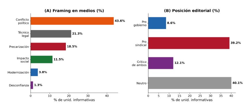 En ese contexto, el gobierno no pudo instalar su narrativa preferida, que presenta al proyecto como una “modernización” de las relaciones laborales. Las noticias sobre el tema en los medios se centraron principalmente en el conflicto político, luego en los aspectos técnicos y legales y luego en la precarización, con sólo un 3,8% de las noticias publicadas al respecto en febrero encuadrándolo en un marco modernizador.