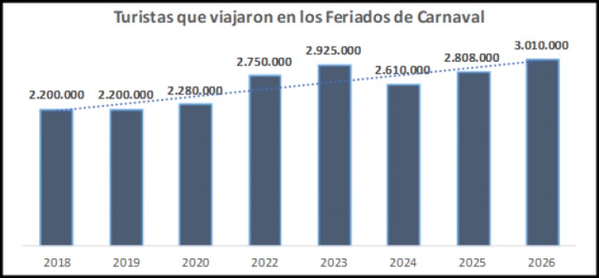 Los números del Carnaval 2026 marcaron un máximo histórico en cantidad de turistas, superando la marca previa de 2023, cuando se habían registrado 2.925.000 viajeros. El crecimiento se dio en un escenario económico restrictivo para los ingresos familiares, lo que refuerza el peso de estas fechas en la dinámica del consumo y el ocio interno.