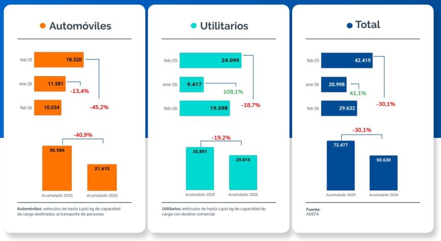 La producción cayó sobre todo en los automóviles, con un –40,9% de variación entre el primer bimestre de 2025 y el primer bimestre de 2026. La fabricación de utilitarios, en tanto, bajó un 19,2%.