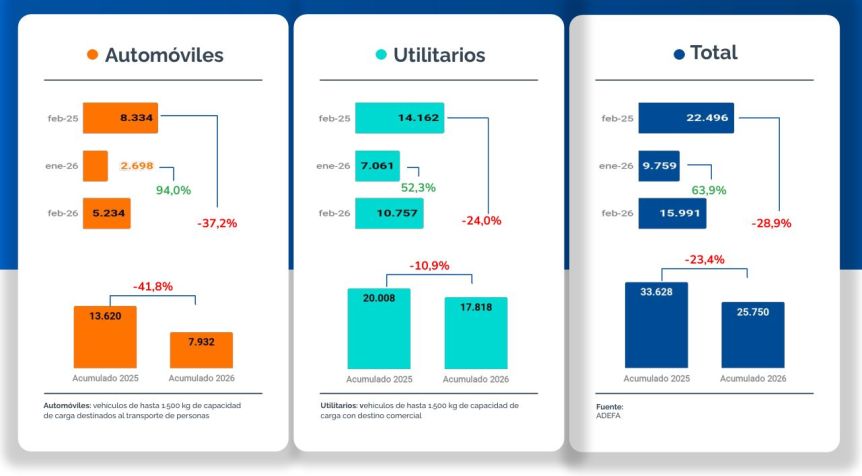 La comparativa interanual realizada por ADEFA arroja un solo dato general positivo: aumentó, y mucho, la venta mayorista de vehículos eléctricos. Entre enero y febrero de 2025 se habían comercializado 225; en lo que va de este año, 6571.