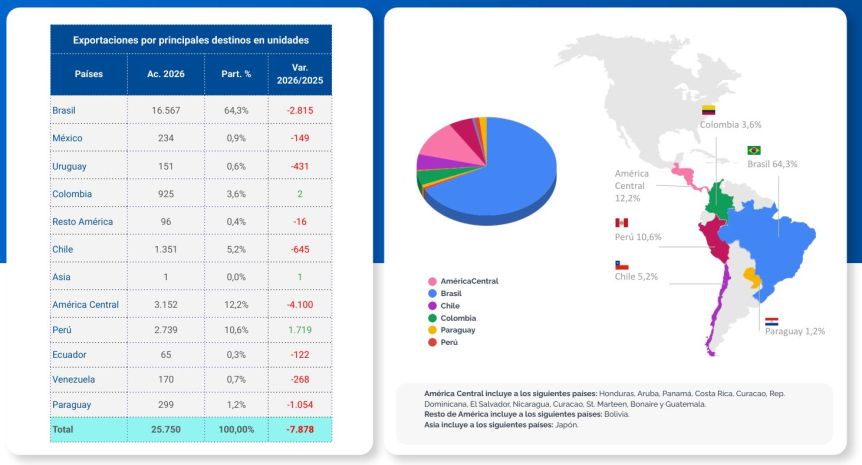 En el desagregado de las exportaciones se advierte la caída general a la mayoría de los destinos. Se vendieron 2815 unidades menos a Brasil y 4100 menos a países de América Central, mientras que también cayeron las ventas a México, Uruguay, Chile y otras naciones del continente.