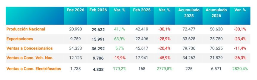 Las exportaciones de estos vehículos, en tanto, alcanzaron las 15.991 unidades: un 63,9% más que las de enero, pero un 28,9% menos que en el mismo mes del año anterior.