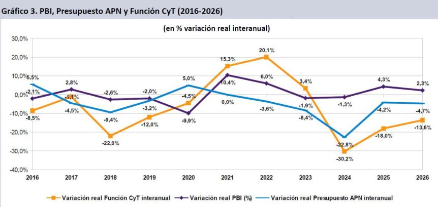 La función ciencia y tecnología (FCyT) de la administración pública nacional (APN) “tendría una caída de doble dígito por tercer año consecutivo, en un contexto en el que el Presupuesto total de la APN caerá levemente respecto de los deprimidos valores de 2025”, indica el estudio del Grupo EPC. “El PBI, bajo supuestos optimistas, retomaría la senda del crecimiento sobre todo en el segundo semestre, luego del incremento del nivel de actividad en 2025 mayormente por arrastre estadístico, y tras un 2024 muy difícil. De esta manera la FCyT tendría caídas reales en ocho de los últimos once años.”