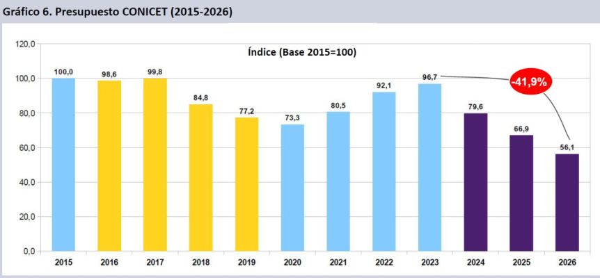 En particular, el Consejo Nacional de Investigaciones Científicas y Técnicas (CONICET) sufrió un ajuste superior al 40% en su crédito vigente (CV) durante el mandato actual. “El CV del CONICET se encuentra entre los más inadecuados y más atrasados del sector, con una pérdida real estimada cercana al 16,1% en el año (-17,7% en 2024; -15,9% en 2025). El organismo, cuyo presupuesto consiste en un 96,0% en salarios y becas de formación, seguramente requerirá ampliaciones en el ejercicio. Con su actual CV perdería 43,9 puntos reales de su presupuesto respecto de los valores de 2015 y 41,9% desde 2023”, indica el trabajo.