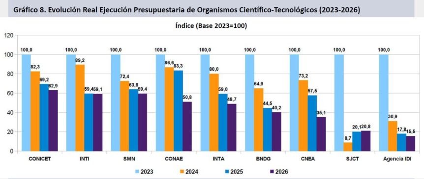 El informe del Grupo EPC muestra que desde la asunción de Milei todos los organismos del área científica del Estado nacional recibieron menos recursos, con caídas drásticas entre 2023 y 2026. La Agencia Nacional de Promoción de la Investigación, el Desarrollo Tecnológico y la Innovación (Agencia I+D+i) fue la que sufrió el recorte más pronunciado.