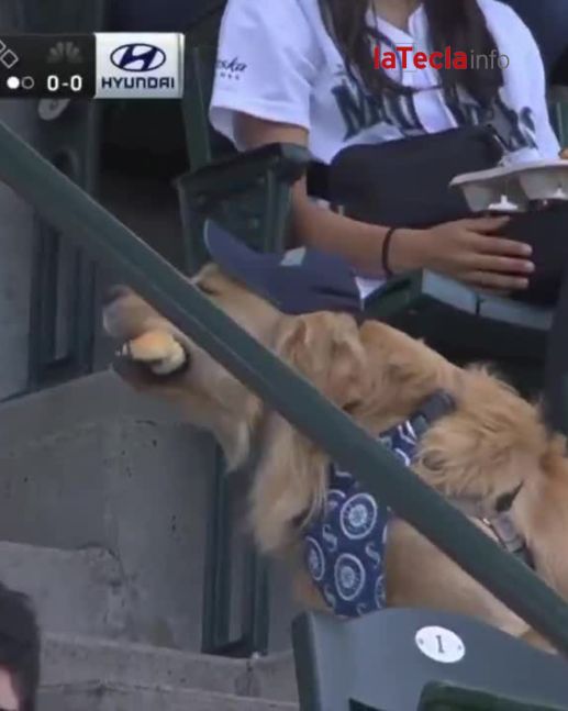 En un partido de baseball, un perrito se llevó todas las miradas cuando la cámara se apartó del juego y lo enfocó mientras comía (o trataba de comer) un panchito.