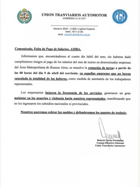 “Informamos que, encontrándonos al cuarto día hábil del mes, sin haberse dado cumplimiento íntegro al pago de los salarios del mes de marzo en determinadas empresas del Área Metropolitana de Buenos Aires, se resuelve la retención de tareas a partir de las 00 horas del día 9 de abril del corriente, en aquellas empresas que no hayan cancelado la totalidad de los haberes, como medida de autotutela de los trabajadores representados”, reza el texto.