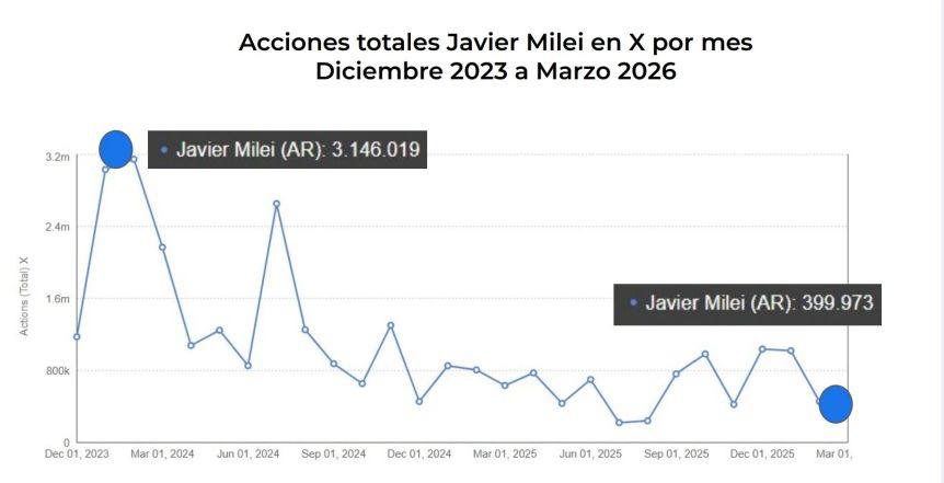 Según el informe elaborado por QSocial Big Data mediante su sistema QMonitor, la “vitalidad digital” del Presidente en X registró una caída del 87% en apenas 27 meses: pasó de 3,1 millones de interacciones mensuales en diciembre de 2023 a unas 400.000 en marzo de 2026. El dato marca un quiebre en la principal plataforma de amplificación del oficialismo, donde Milei había logrado imponer agenda y alta viralización.